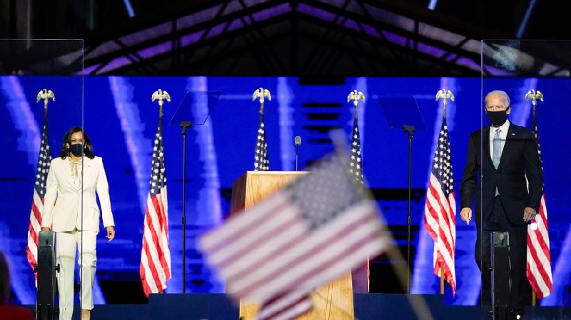 La senadora Kamala Harris, a la izquierda, y el exvicepresidente Joe Biden tras dirigirse a la nación desde WIlmingon, Delaware, el 7 de noviembre de 2020. Foto: Reuters