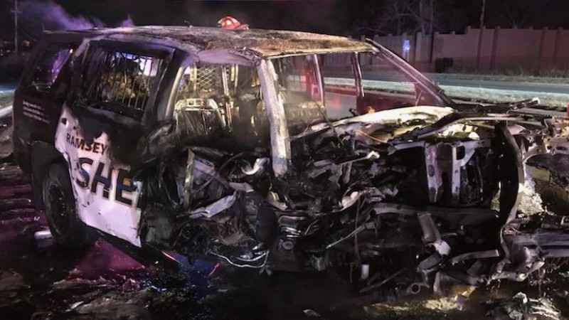 Después de que la patrulla del oficial fuera alcanzada, giró y chocó contra otro vehículo antes de incendiarse.