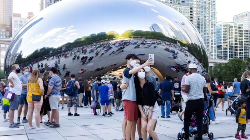 Estas imágenes, captadas por la agencia Reuters, muestran a residentes y visitantes de Chicago disfrutando de la escultura Cloud Gate y sus alrededores, en Millennium Park, en Illinois, el 5 de septiembre de 2021.
