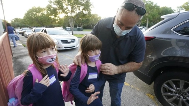 Anthony Sacco deja a sus hijas Angelina, de 7 años, (izquierda), y Victoria, de 5, para su primer día de clases en la primaria Fox Trail, el viernes 9 de octubre de 2020, en Davie, Florida. Foto: VOA