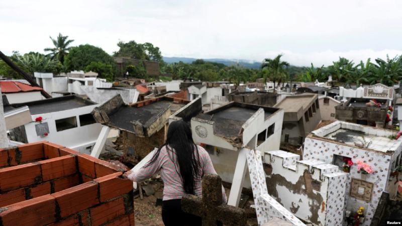 Una mujer mira los escombros de un cementerio destruido después de horas de fuertes lluvias que, según las autoridades, provocaron un deslizamiento de tierra por una falla geológica en Piojo, Colombia, el 6 de noviembre de 2022./Foto: Reuters.