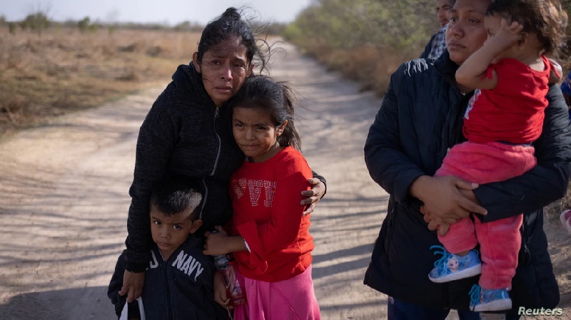 Dos solicitantes de asilo guatemaltecas con sus hijos esperan por transportación tras cruzar el Río Grande desde México a Texas, EE. UU., en una balsa el 10 de marzo de 2021. Foto: Reuters