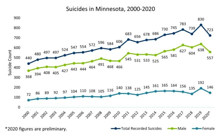Las tasas de suicidio en Minnesota y en todo el país han aumentado constantemente durante los últimos 20 años, y 2020 marca el sexto año consecutivo en el que más de 700 habitantes de Minnesota han muerto por suicidio, dice MDH.
