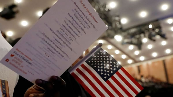 Nuevos ciudadanos de pie durante una ceremonia de naturalización del Servicio de Ciudadanía e Inmigración de los Estados Unidos (USCIS) en el Museo y Biblioteca de la Sociedad Histórica de Nueva York en Manhattan. Foto: Reuters