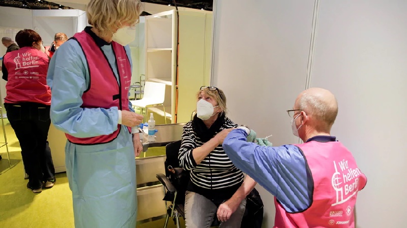 Una mujer es vacunada contra la enfermedad del coronavirus (COVID-19) en el centro de vacunación Treptow Arena en Berlín, Alemania. Diciembre 27 de 2020. Foto: Reuters