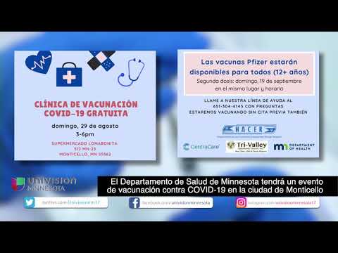 El Departamento de Salud de Minnesota en colaboración con CentraCare y Tri-valley tendrán un evento de vacunación comunitaria contra COVID-19 ofreciendo la vacuna Pfizer para todas las personas mayores de 12 años. Este evento está especialmente dirigido a nuestra comunidad latina, será en el SuperMercado Loma Bonita ubicado en el 512 MN-25 en Monticello, MN 55362. Se llevará acabo este Domingo 29 de Agosto desde las 3:00pm hasta las 6:00pm y se aplicará la 2da dosis el Domingo 19 de Septiembre en el mismo lugar y horario. no es necesario tener cita previa ni presentar seguro médico o identificación, pero si desea agendar su cita o tiene alguna pregunta, llame al 651-304-6145. Proteja a sus seres queridos y ¡Aproveche esta oportunidad para vacunarse!