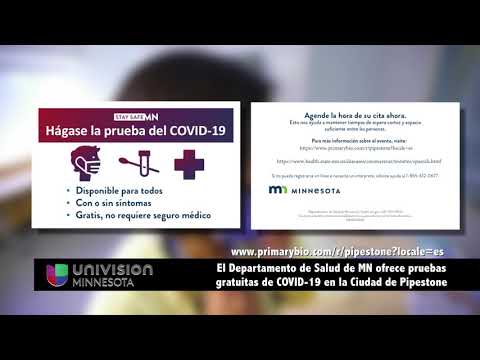 Manténgase seguro Minnesota y hágase una prueba comunitaria gratuita de COVID-19 durante los eventos que serán el Miércoles 4 de Noviembre de 2:00 p.m. a 6:00 p.m. y el Jueves 5 de Noviembre de 12:00 a 6:00 p.m se llevarán acabo en National Guard Armory con dirección en 421 2nd Ave SW en la Ciudad de Pipestone, Minnesota código postal 56154. Las pruebas se realizarán con un hisopo nasal, se la podrá realizar tenga o no síntomas y no necesita presentar seguro médico ó identificación. Agende la hora de su cita al link que aparece en pantalla para ayudar a mantener tiempos de espera cortos y espacio suficiente entre las personas. Si no puede inscribirse en línea o necesita un intérprete, llamé al 1-855-612-0677 El Departamento de Salud de Minnesota (MDH) trabaja en asociación con las comunidades para proporcionar pruebas COVID-19 seguras y gratuitas en áreas con brotes, casos cada vez mayores u otras barreras para acceder a los sitios de prueba existentes.