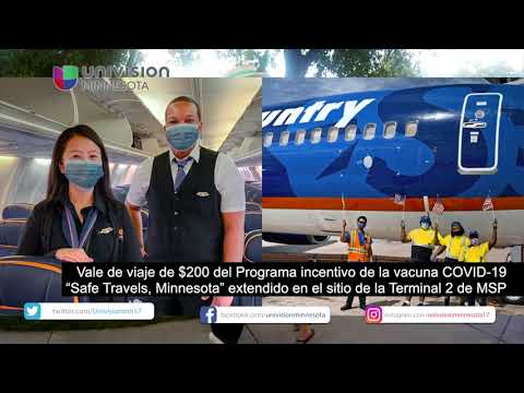 Vale de viaje de $200 del Programa incentivo de la vacuna COVID-19 “Safe Travels, Minnesota” extendido en el sitio de la Terminal 2 de MSP El gobernador Tim Walz anunció la extensión de la asociación de incentivos de vacunas con Sun Country Airlines alentando a los habitantes de Minnesota a recibir la vacuna Johnson & Johnson COVID-19 en la Terminal 2 del aeropuerto MSP hasta el 22 de septiembre y participar en un sorteo semanal por un vale de viaje de $200 a través de Sun Country Airlines, Un programa que se lanzó el 1 de julio. “Ya sea que viaje o no, la vacuna es el boleto para proteger a su familia del COVID-19”, dijo el gobernador Walz. “Obtener la vacuna segura, gratuita y eficaz es vital para frenar la propagación de COVID-19. Es por eso que continuamos nuestro trabajo en la Terminal 2 para facilitar a los habitantes de Minnesota ayudándolos a vacunarse lo antes posible. “Vacunarse por completo es el paso más importante que puede dar para asegurarse de que usted y su familia estén a salvo, ya sea en su viaje o aquí en casa”, dijo la vicegobernadora Peggy Flanagan.